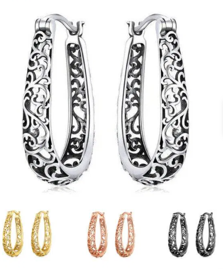 boucles d'oreilles cerceau pliantes vintage à motifs floraux, or, argent, noir.